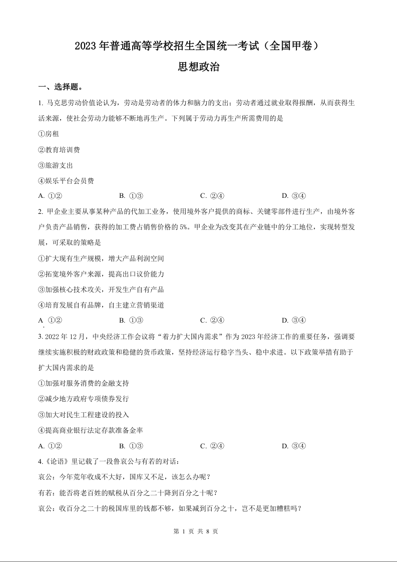 2023年思想政治高考真题--全国甲卷