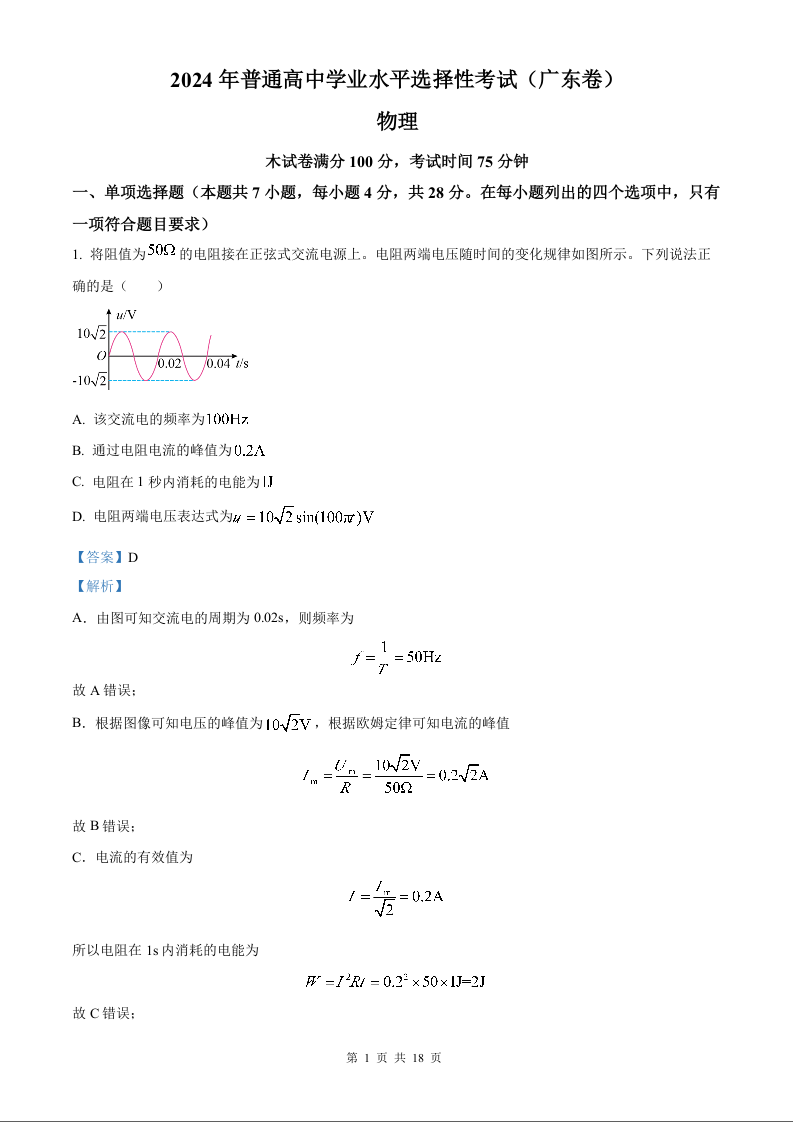 2024年高考物理真题(解析版)---广东卷
