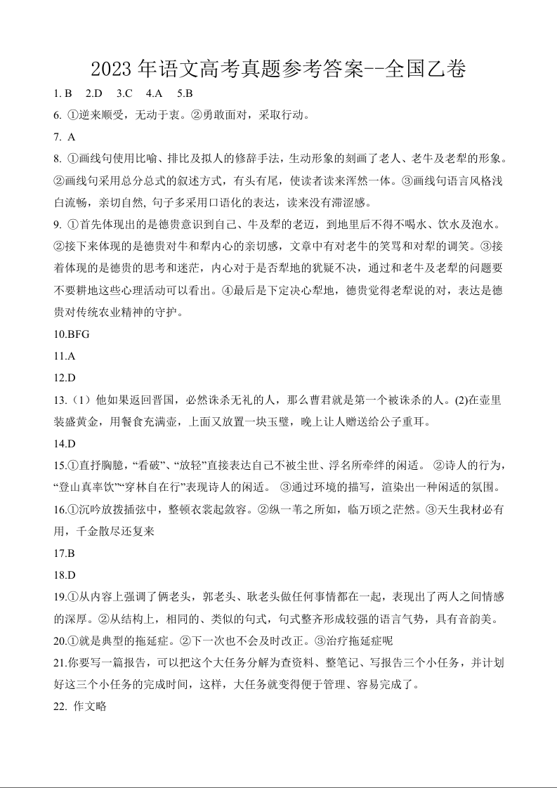2023年语文高考真题参考答案--全国乙卷