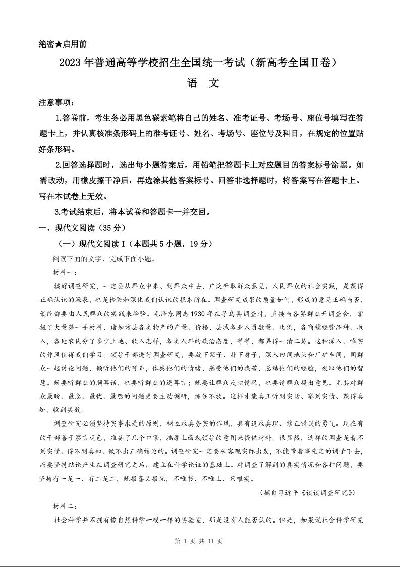 2023年语文高考真题和答案--新高考全国Ⅱ卷