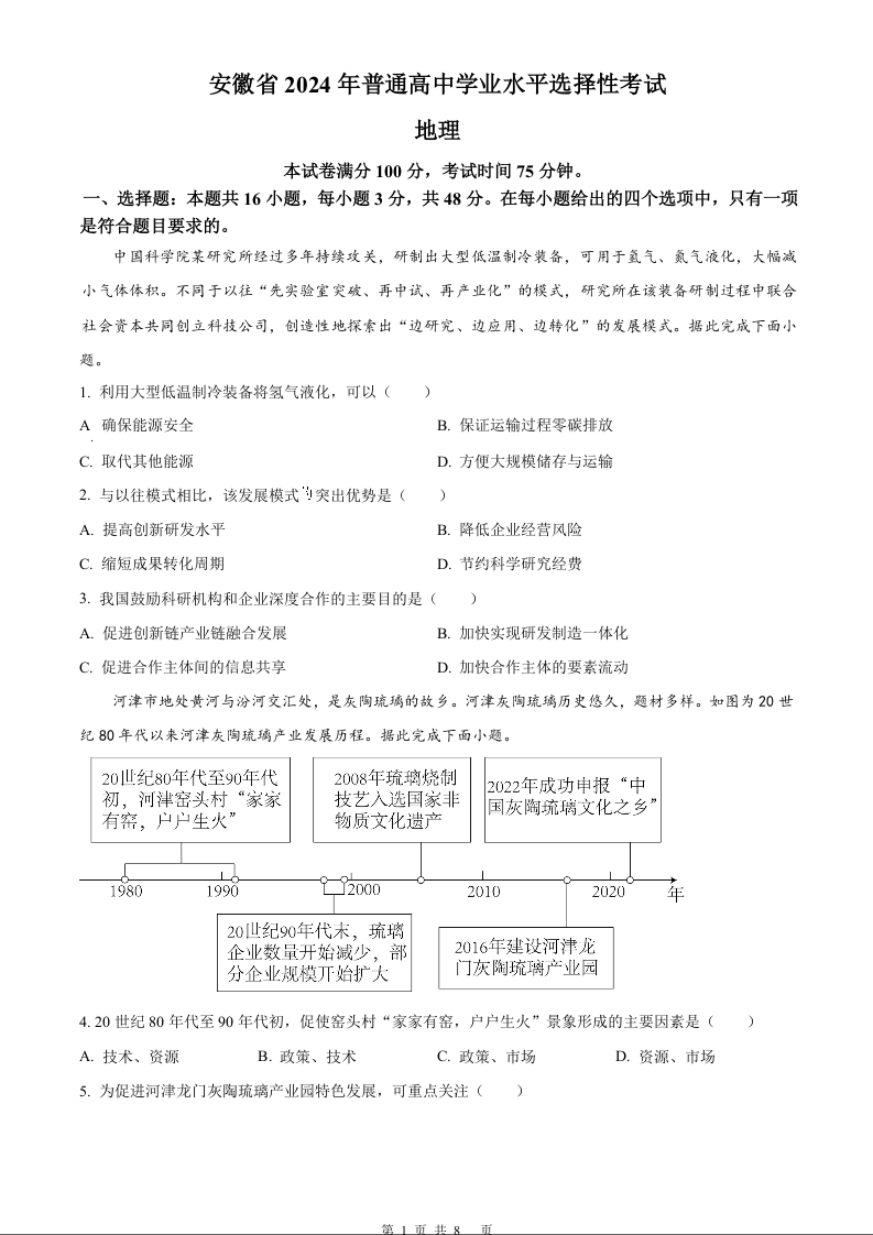 2024年地理高考真题--安徽卷