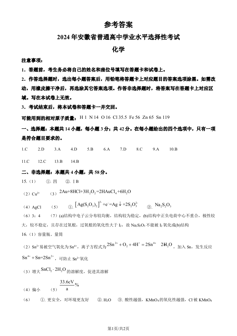 2024年安徽省高考化学参考答案