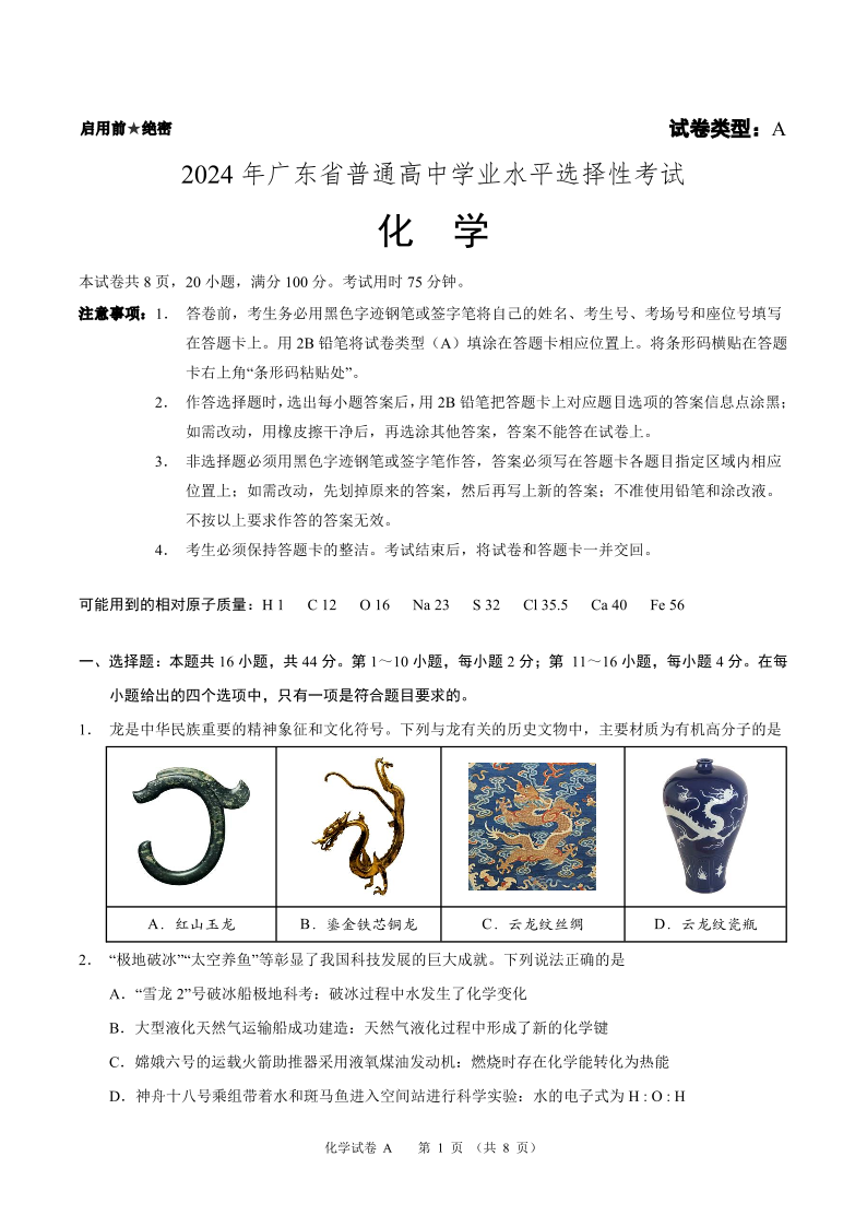 2024年高考化学试题及答案--广东卷