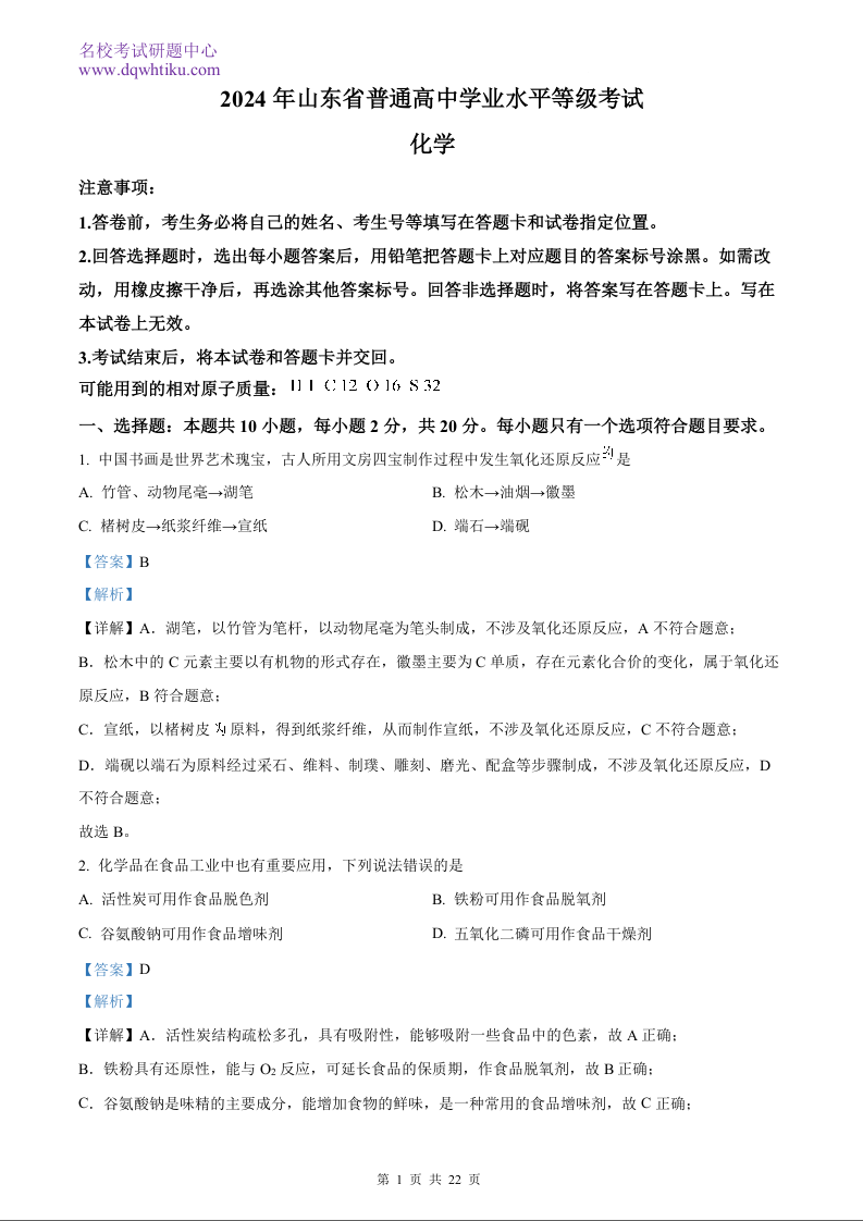 2024年高考真题山东卷化学试题及解析