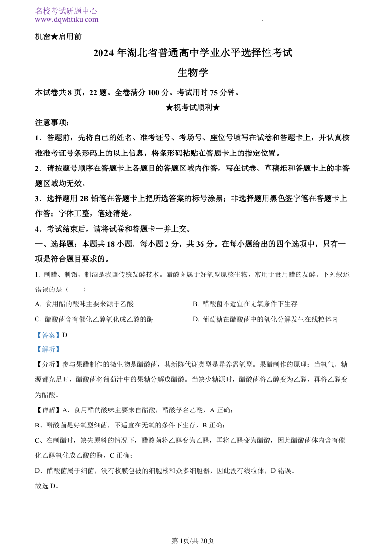 2024年高考生物真题--湖北卷