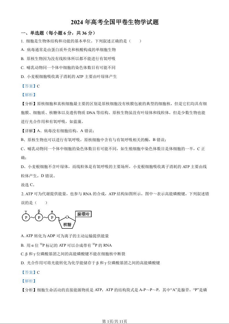 2024年高考生物真题--全国甲卷