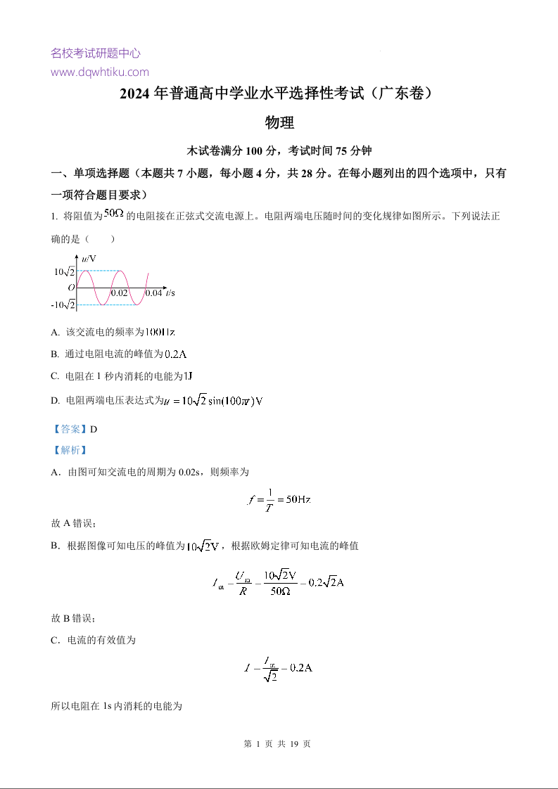 2024年高考物理真题(解析版)---广东卷