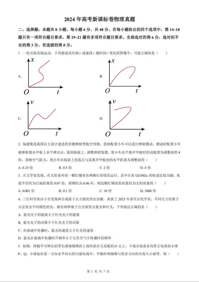 2024年高考新课标卷物理真题及参考答案