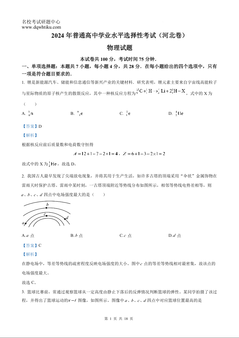 2024年物理高考真题(解析版)--河北卷