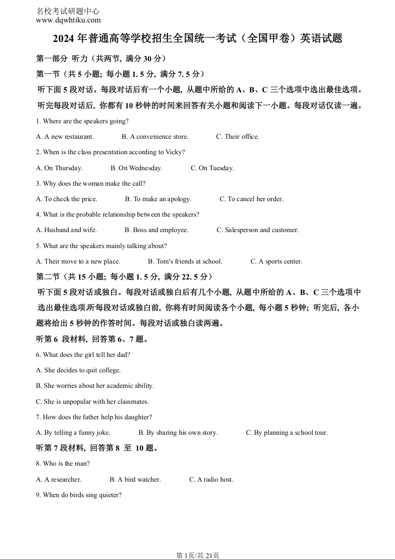 2024年高考英语真题--全国甲卷