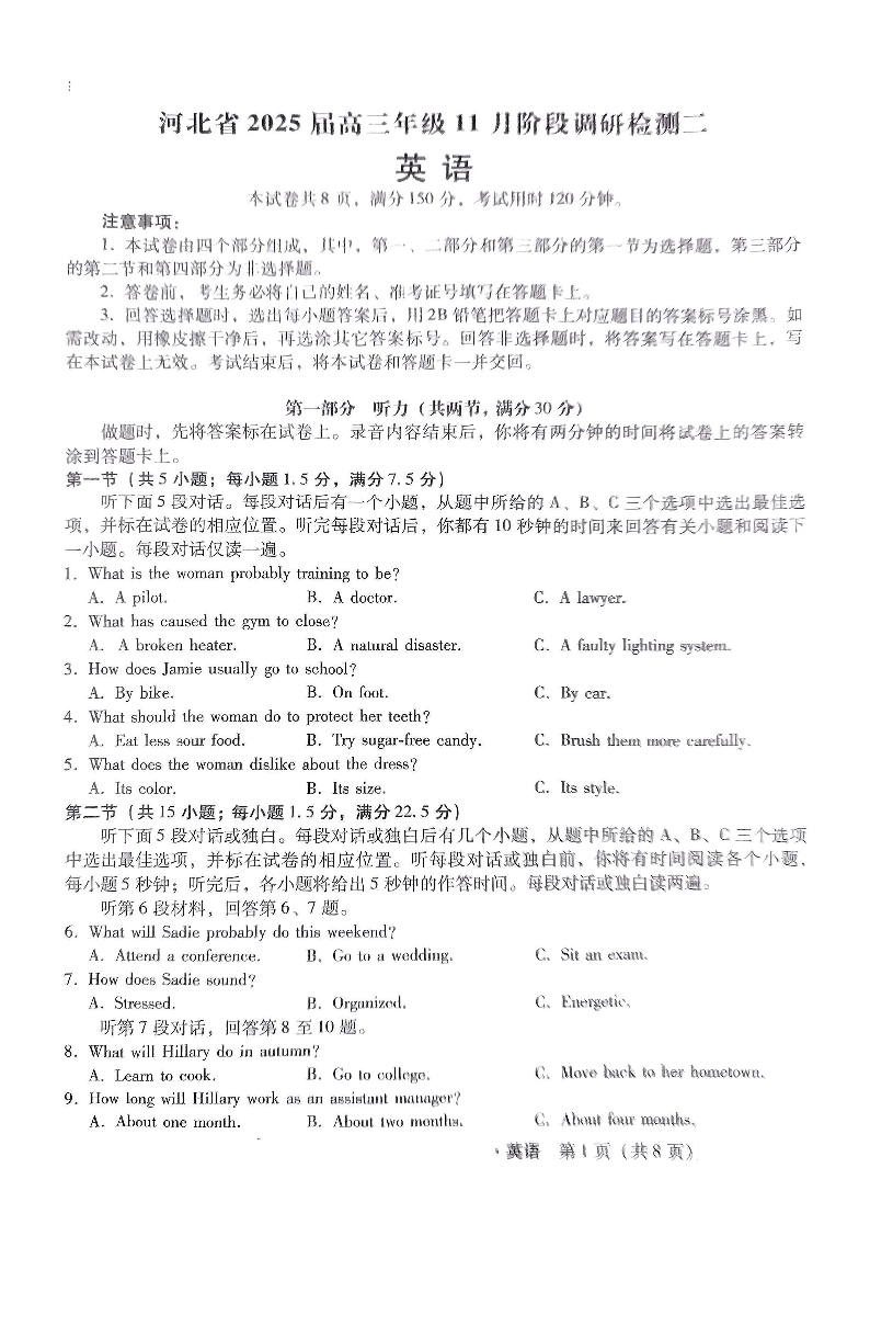 河北省2025届高三年级11月阶段调研检测英语试题