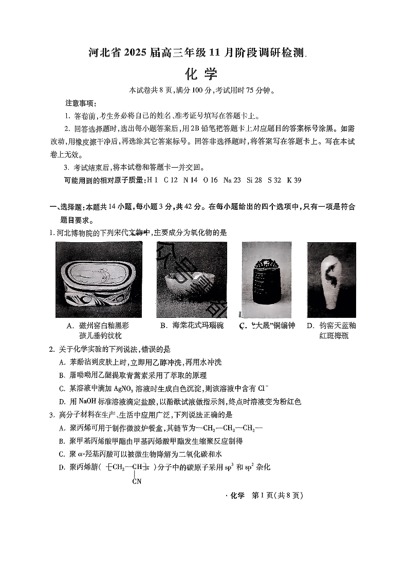 河北省2025届高三年级11月阶段调研检测化学+答案