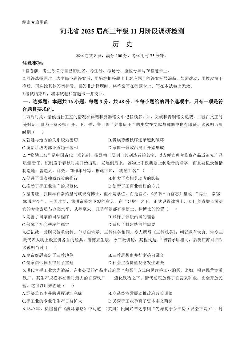 河北省2025届高三年级11月阶段调研检测历史试题(含答案)