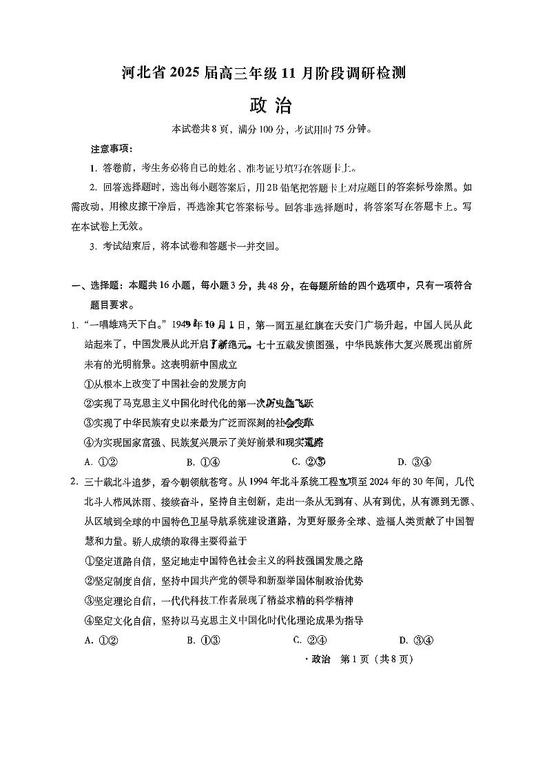 河北省2025届高三年级11月阶段调研检测政治+答案