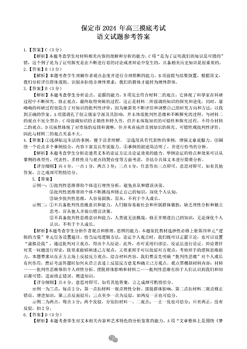 河北省保定市2025届高三摸底考试(保定一模)语文答案