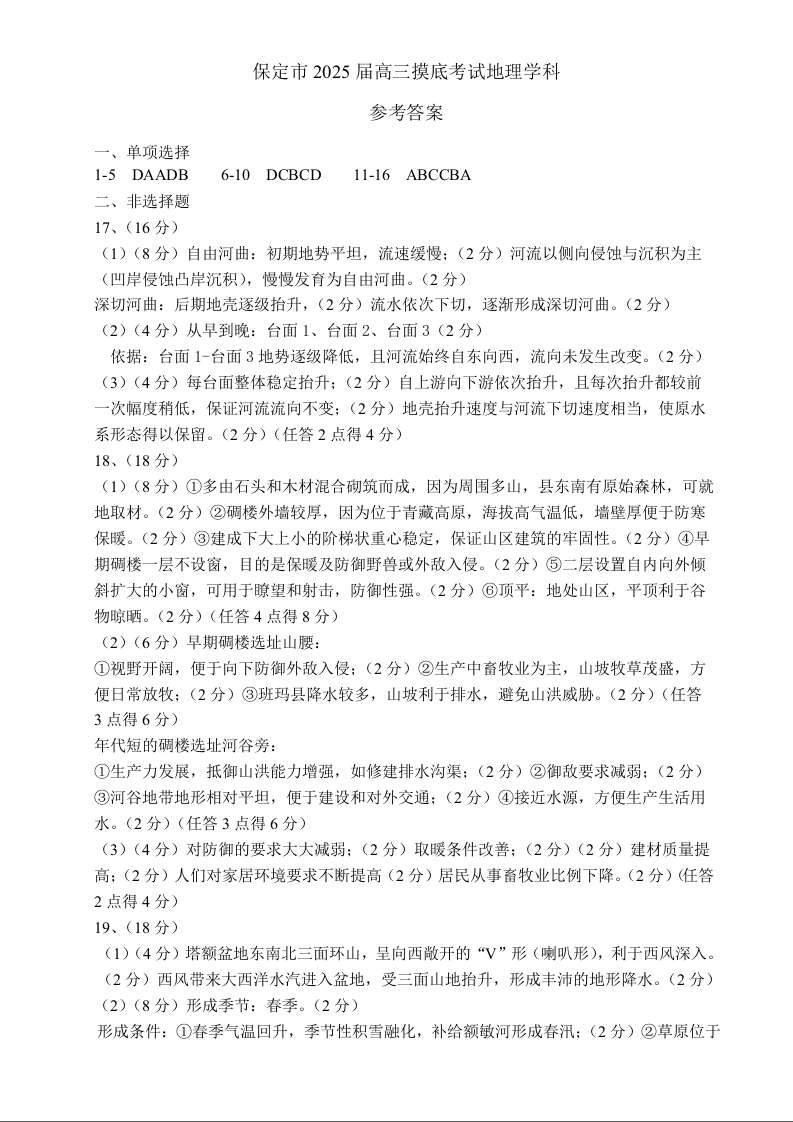 河北省保定市2025届高三摸底考试(保定一模)地理答案