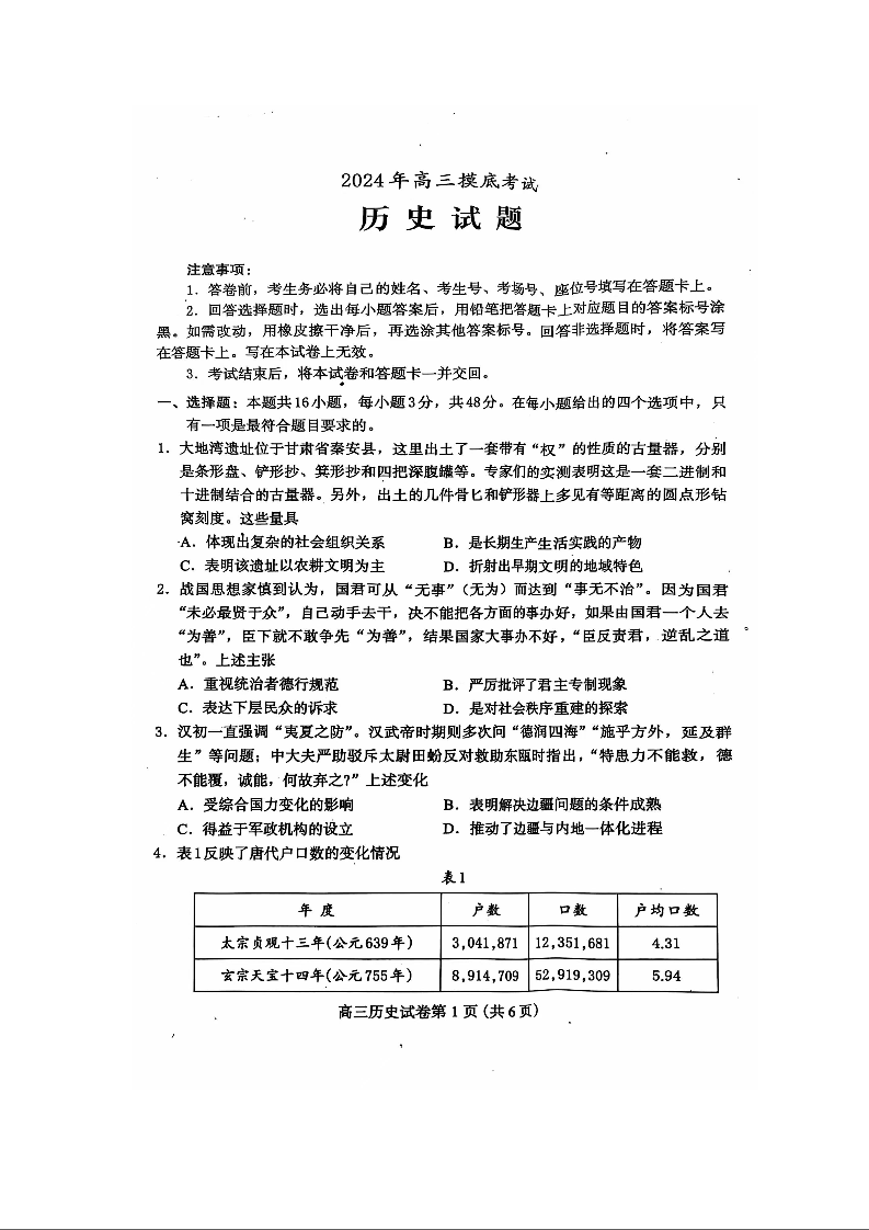 河北省保定市2025届高三摸底考试(保定一模)历史