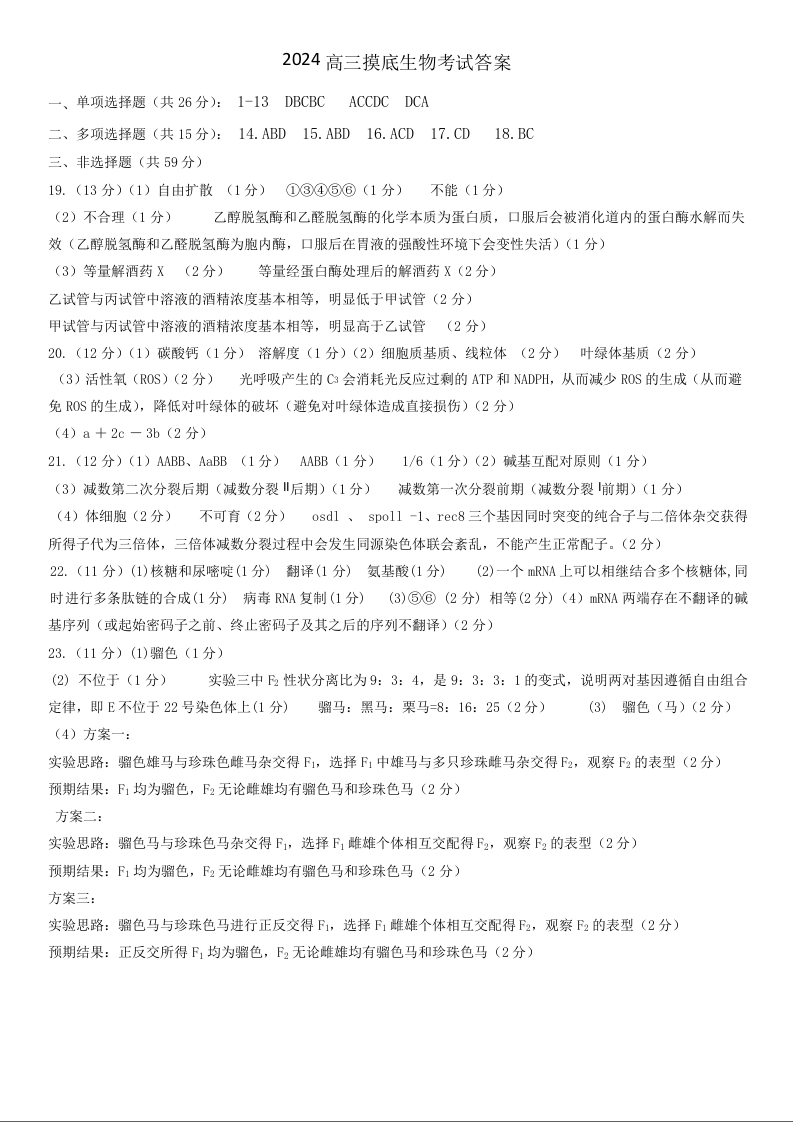 河北省保定市2025届高三摸底考试(保定一模)生物答案