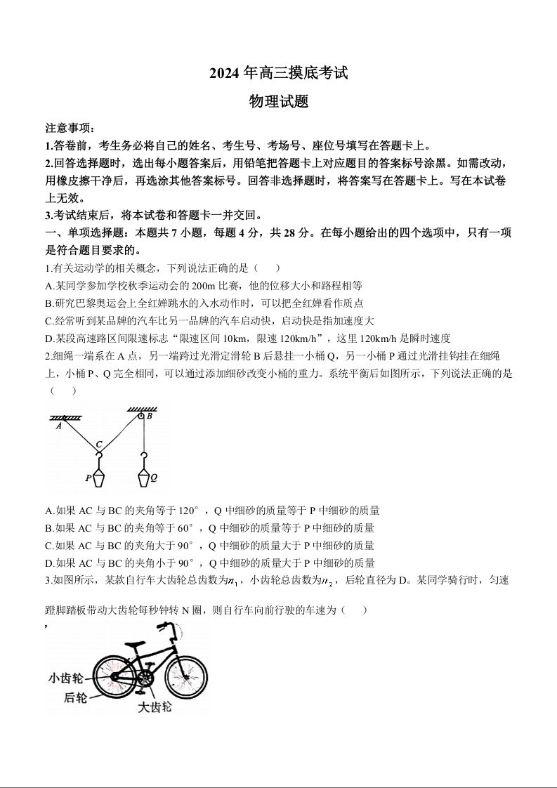 河北省保定市2025届高三摸底考试(保定一模)物理