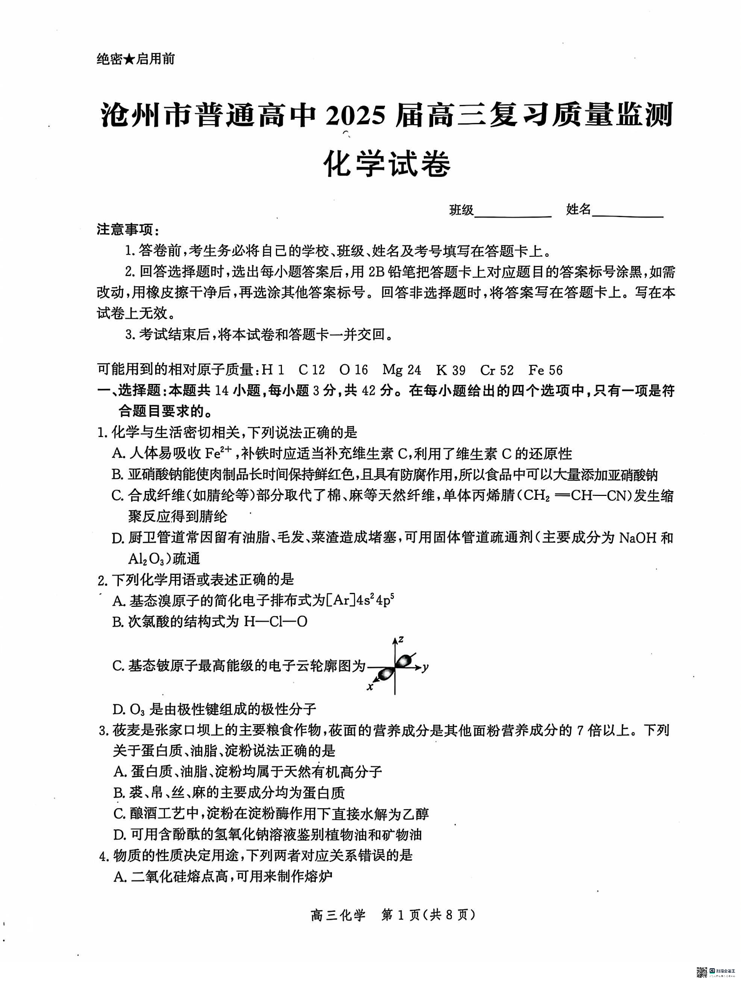 河北省沧州市2025届高三10月复习质量监测+化学