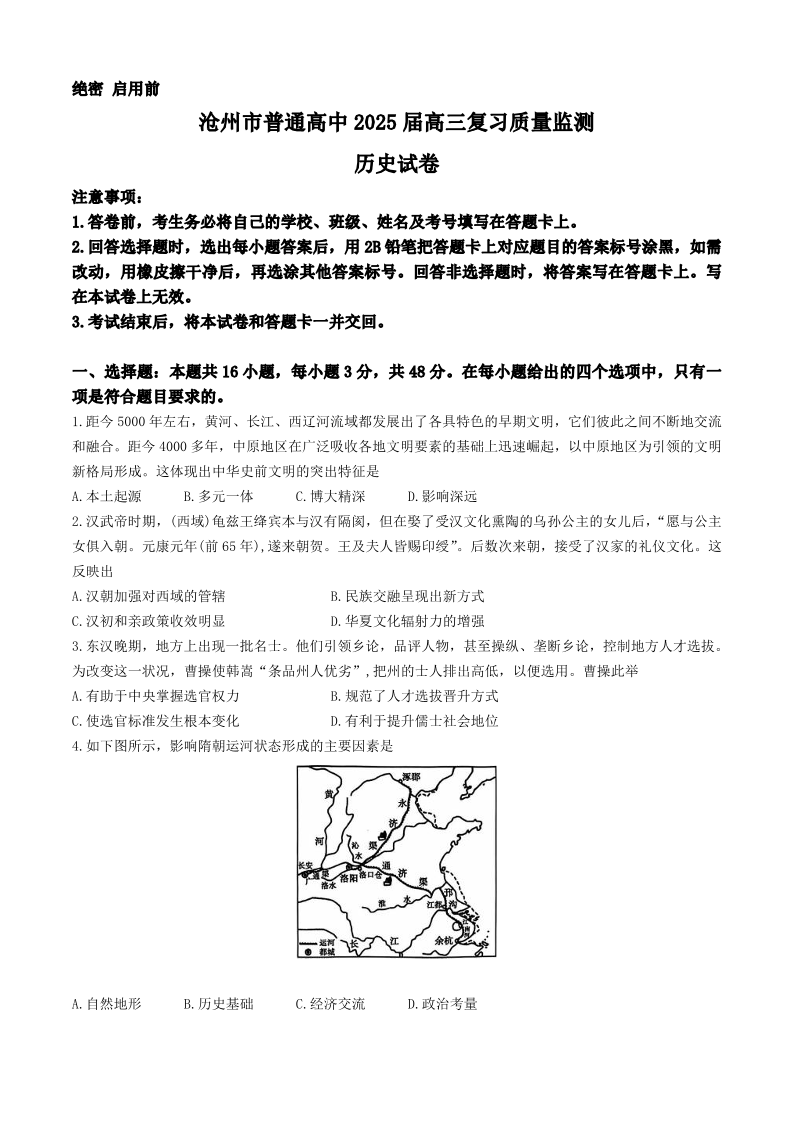 河北省沧州市2025届高三10月复习质量监测+历史