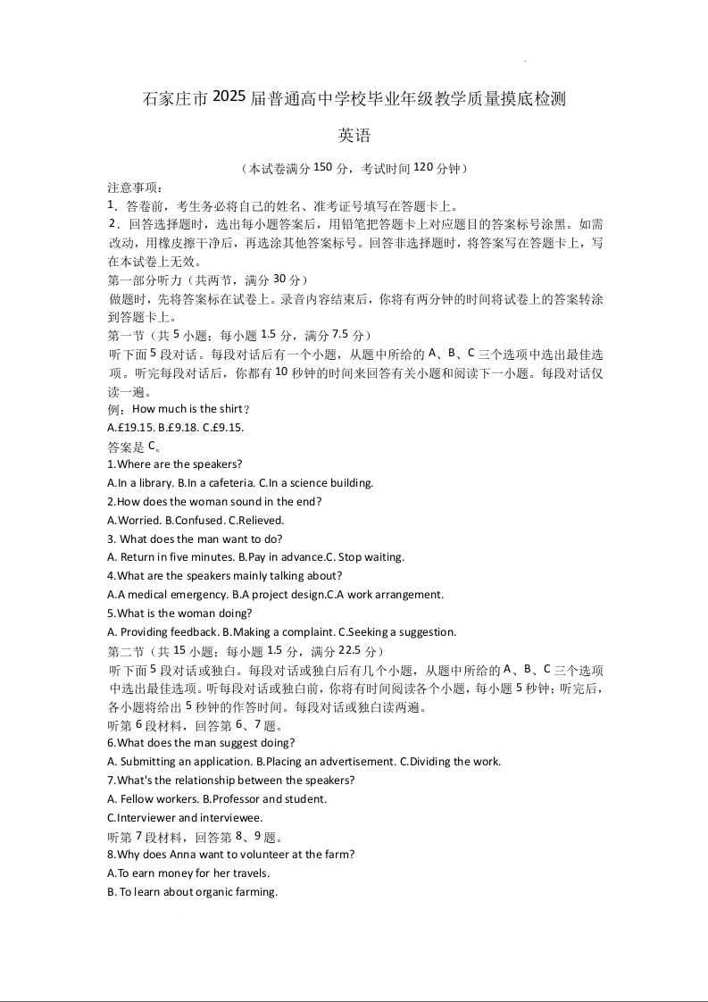 河北省石家庄市2025届高三上学期教学质量摸底检测英语试卷