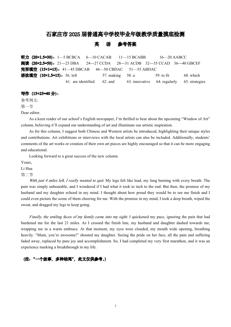 河北省石家庄市2025届高三上学期教学质量摸底检测英语答案
