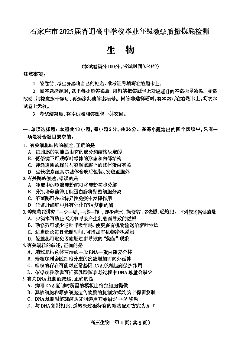 河北省石家庄市2025届高三上学期教学质量摸底检测生物试卷+答案