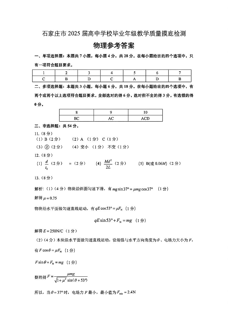 河北省石家庄市2025届高三上学期教学质量摸底检测物理参考答案
