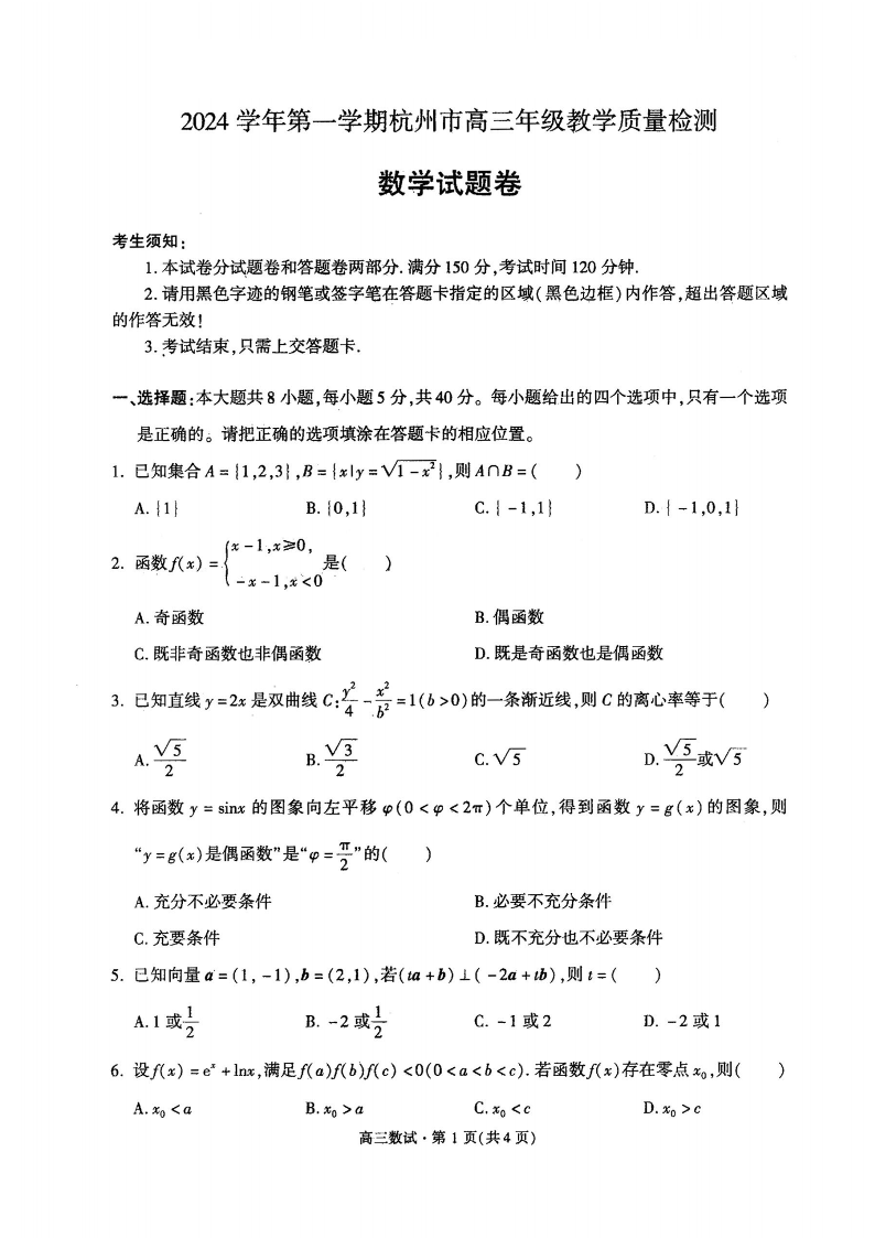 浙江省2025届高三杭州一模数学试卷