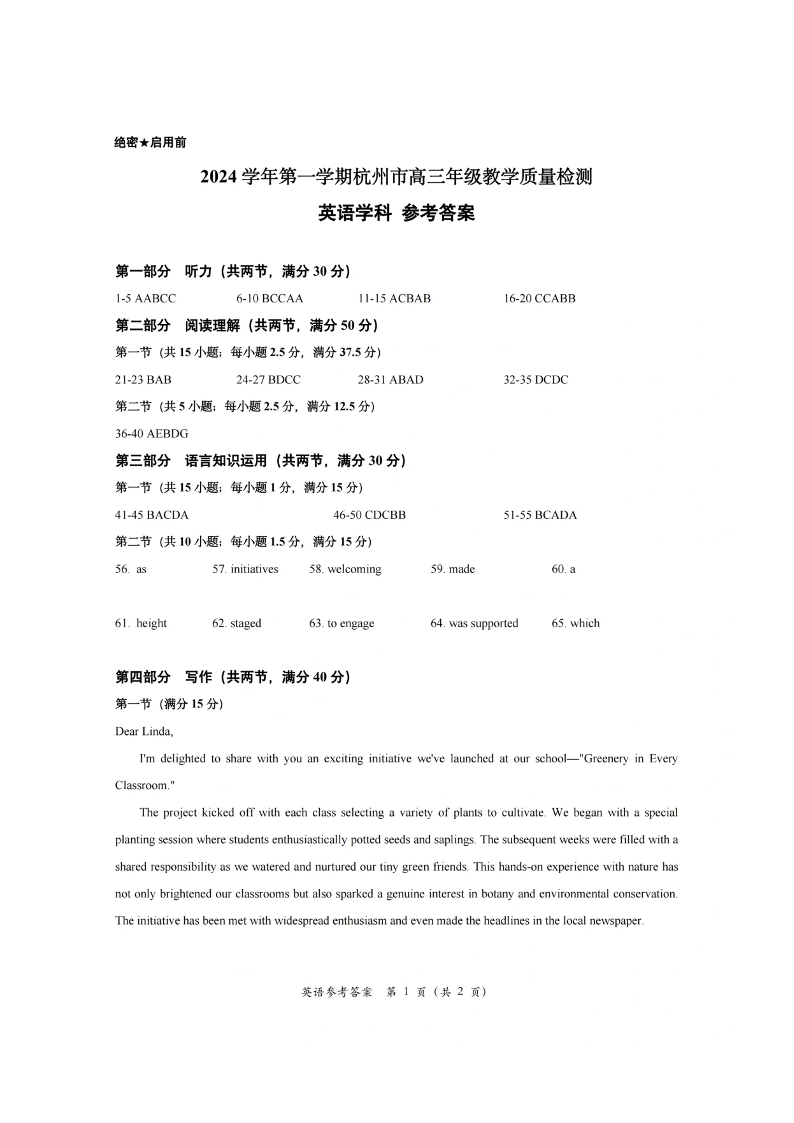 浙江省2025届高三杭州一模英语答案