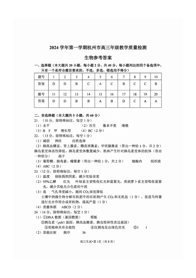 浙江省2025届高三杭州一模生物答案