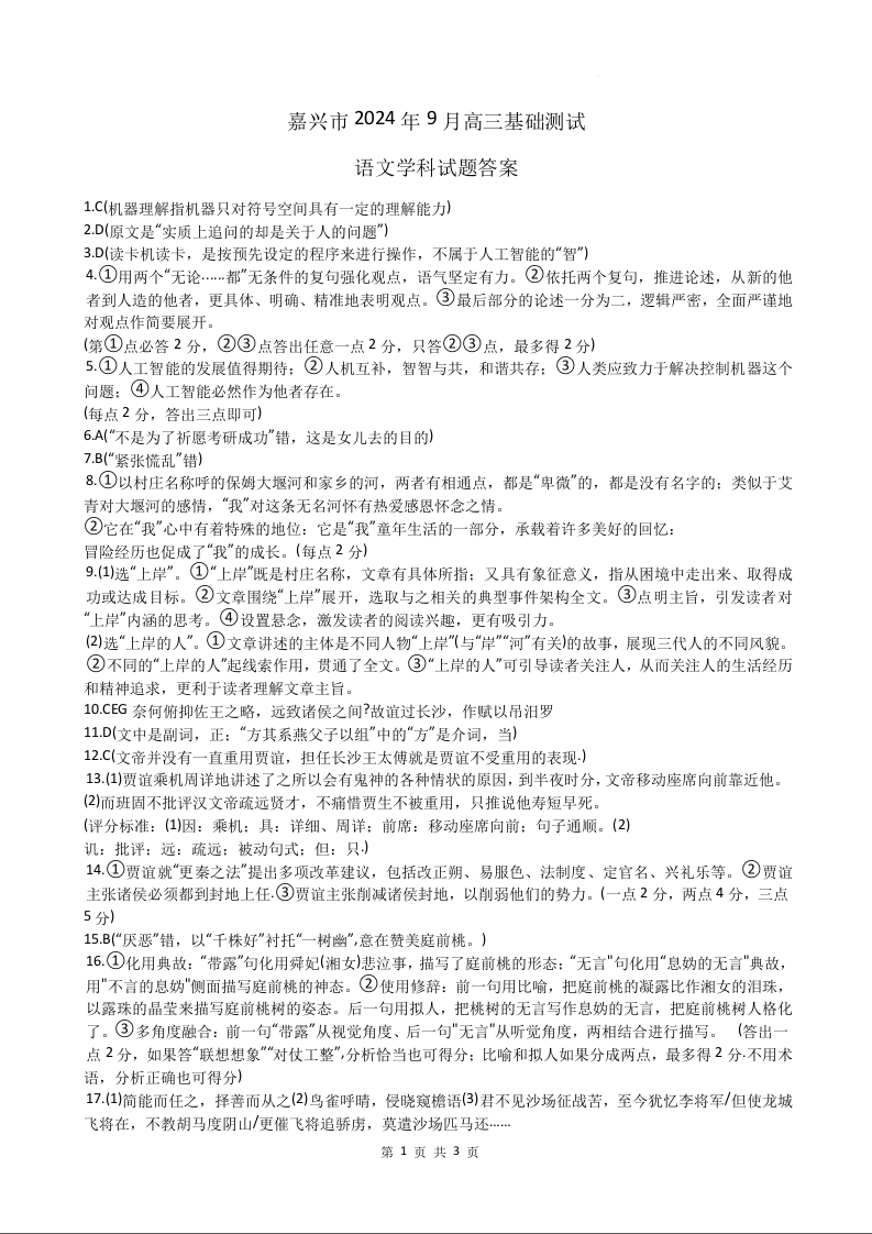 浙江省嘉兴市2024-2025学年高三基础测试+语文答案