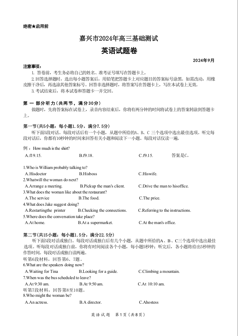 浙江省嘉兴市2024-2025学年高三基础测试+英语