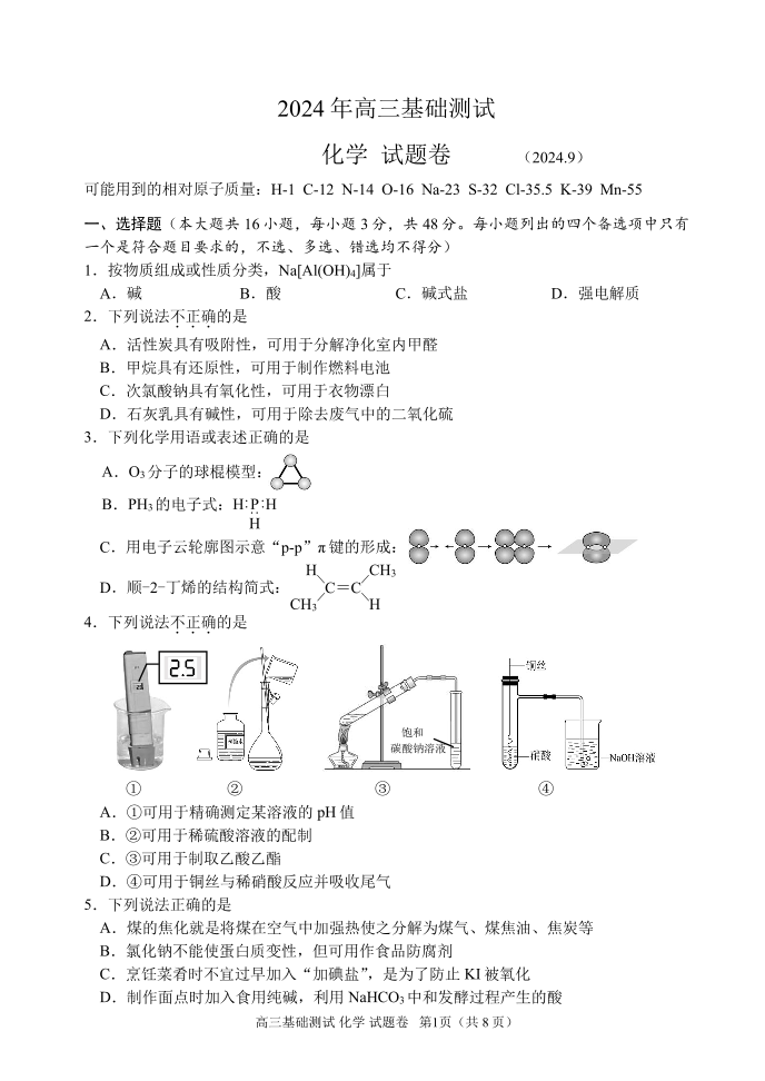 浙江省嘉兴市2024-2025学年高三基础测试+化学