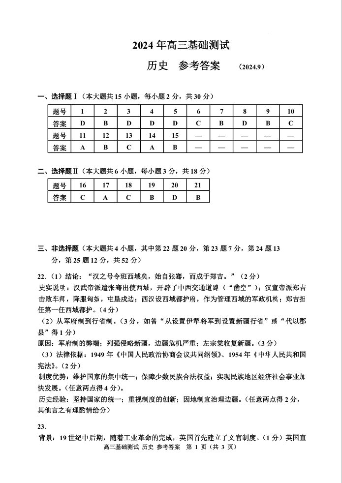 浙江省嘉兴市2024-2025学年高三基础测试+历史答案