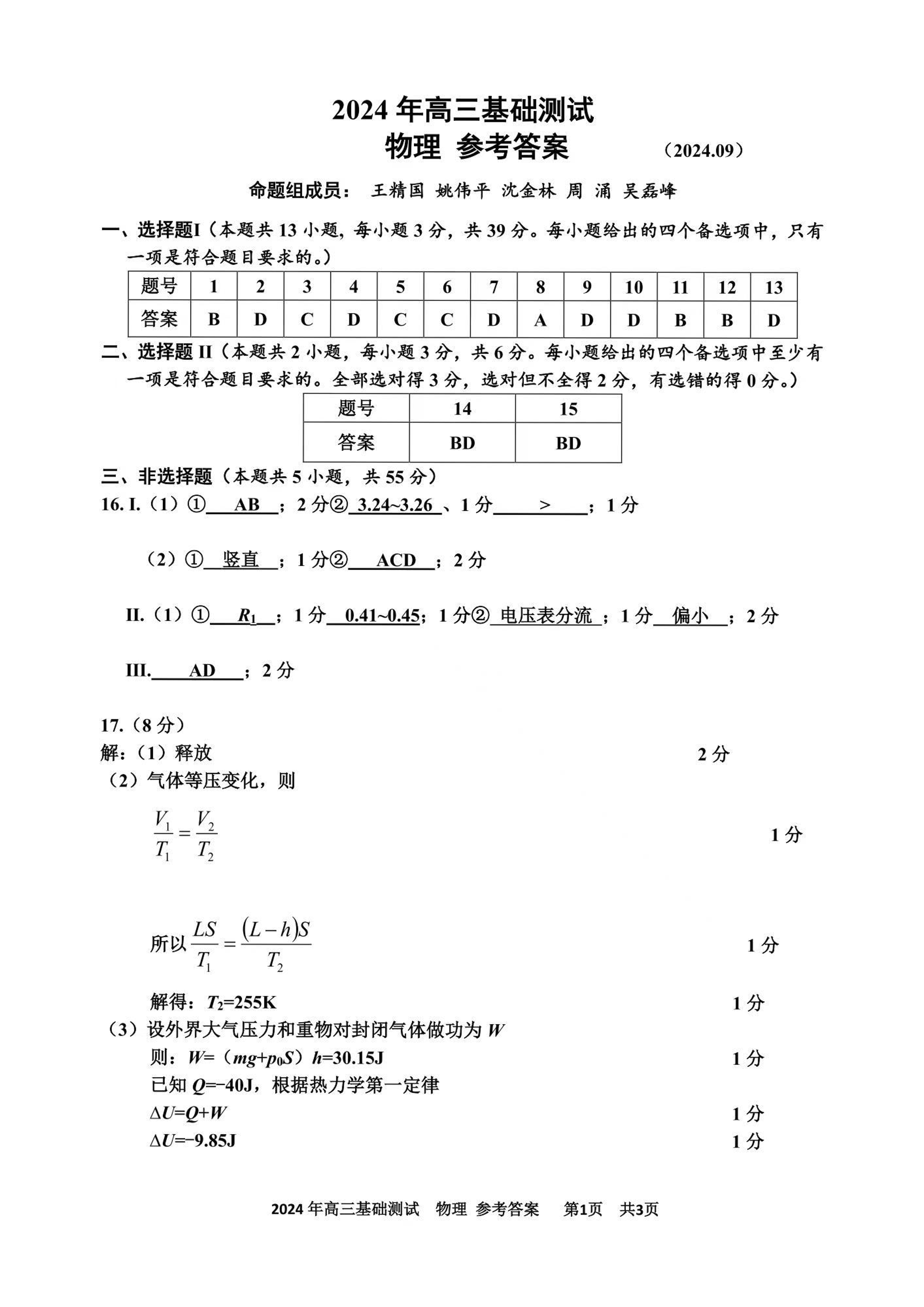 浙江省嘉兴市2024-2025学年高三基础测试+物理答案