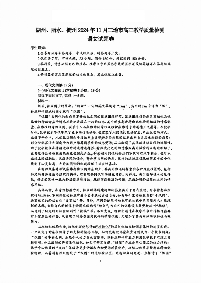 浙江省湖丽衢2024年11月三地市教学质量检测试卷+语文