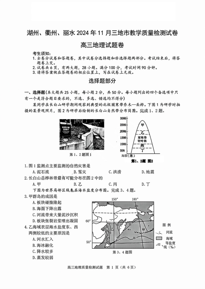 浙江省湖丽衢2024年11月三地市教学质量检测试卷+地理