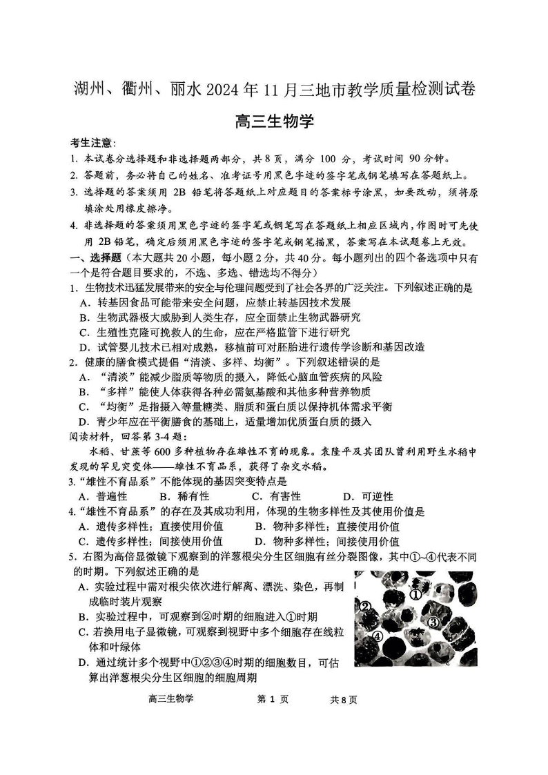 浙江省湖丽衢2024年11月三地市教学质量检测试卷+生物