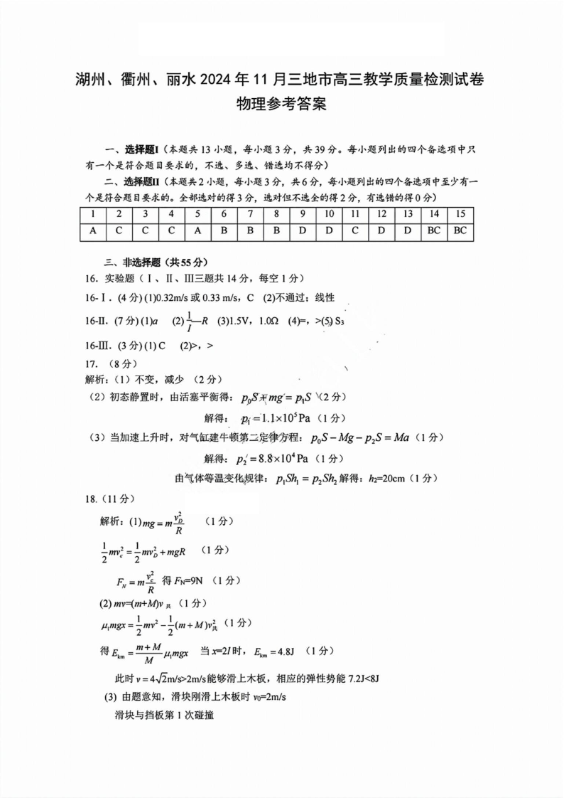浙江省湖丽衢2024年11月三地市教学质量检测试卷+物理答案
