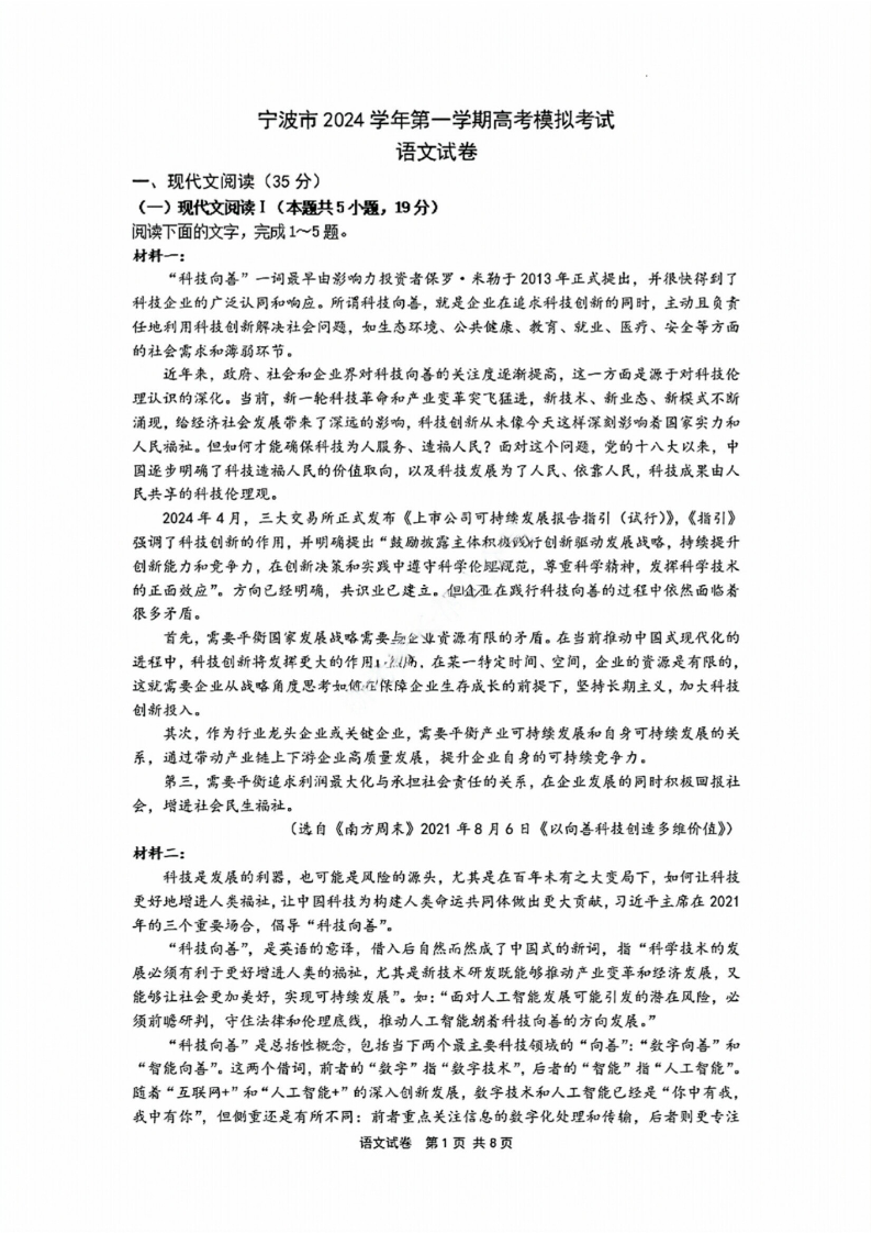 宁波市2024学年第一学期高三模拟考试+语文