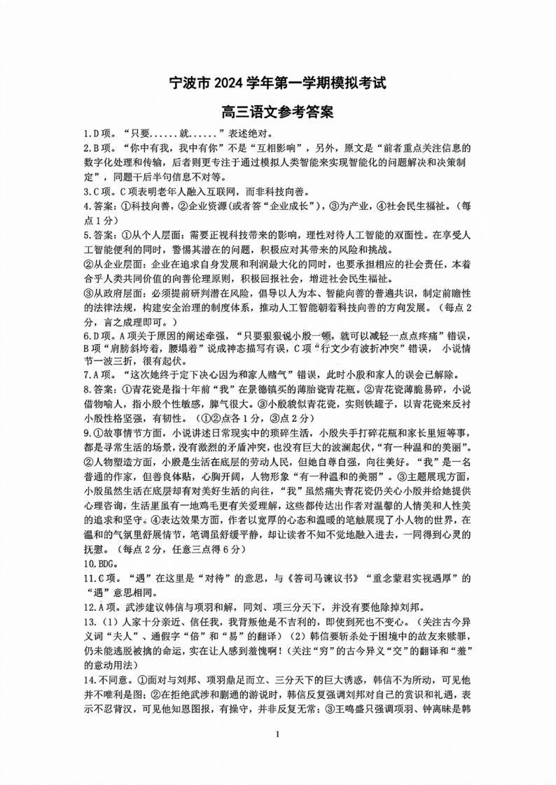宁波市2024学年第一学期高三模拟考试+语文答案