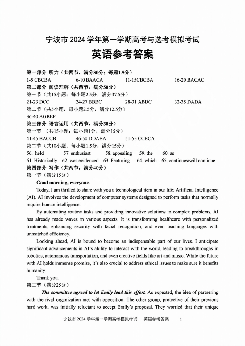 宁波市2024学年第一学期高三模拟考试+英语答案