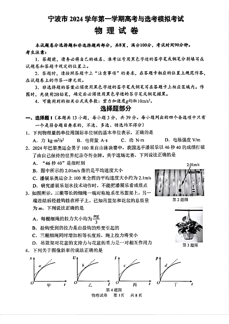 宁波市2024学年第一学期高三模拟考试+物理