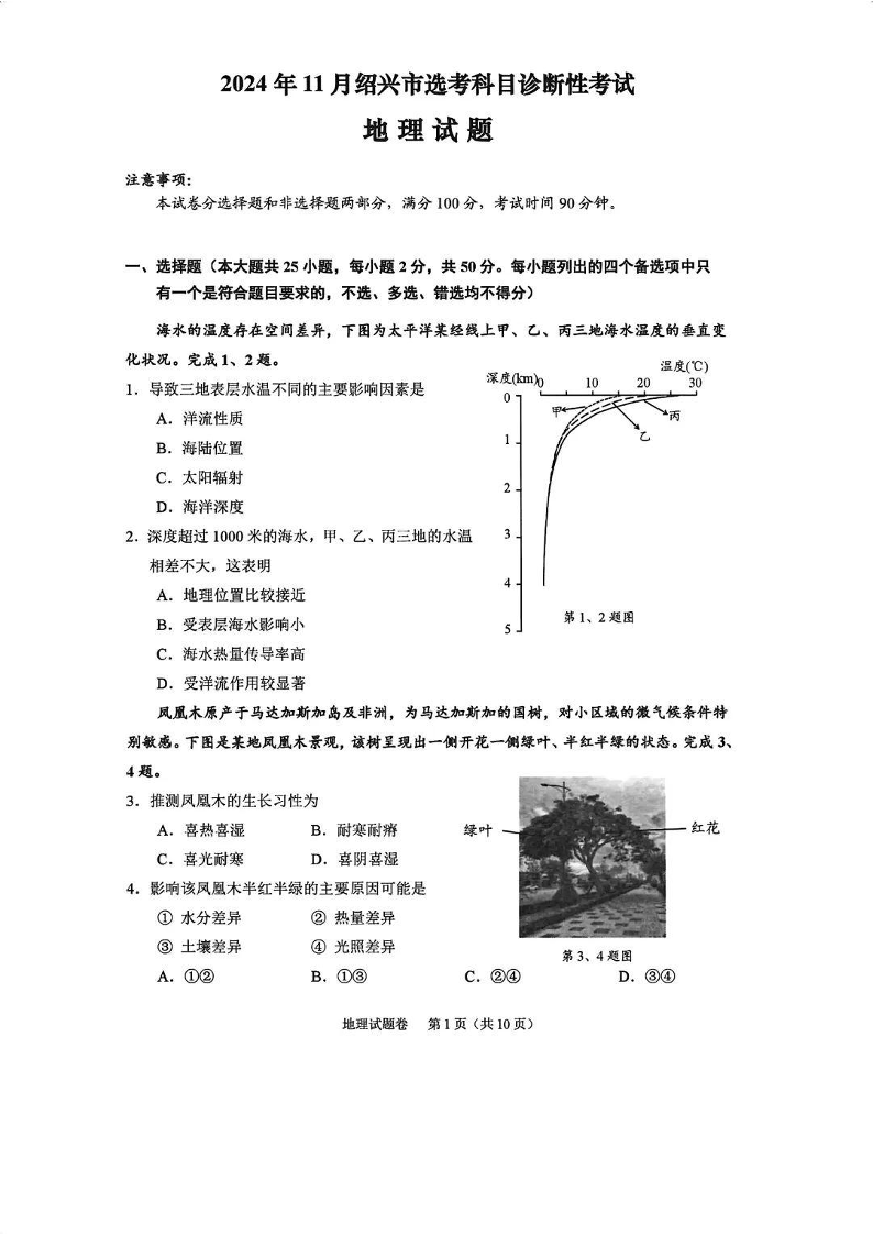 2024年11月绍兴市高考科目诊断性考试+地理