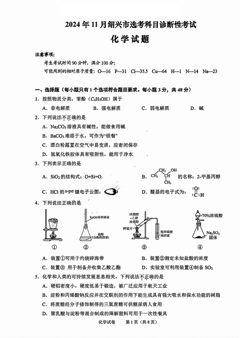 2024年11月绍兴市高考科目诊断性考试+化学