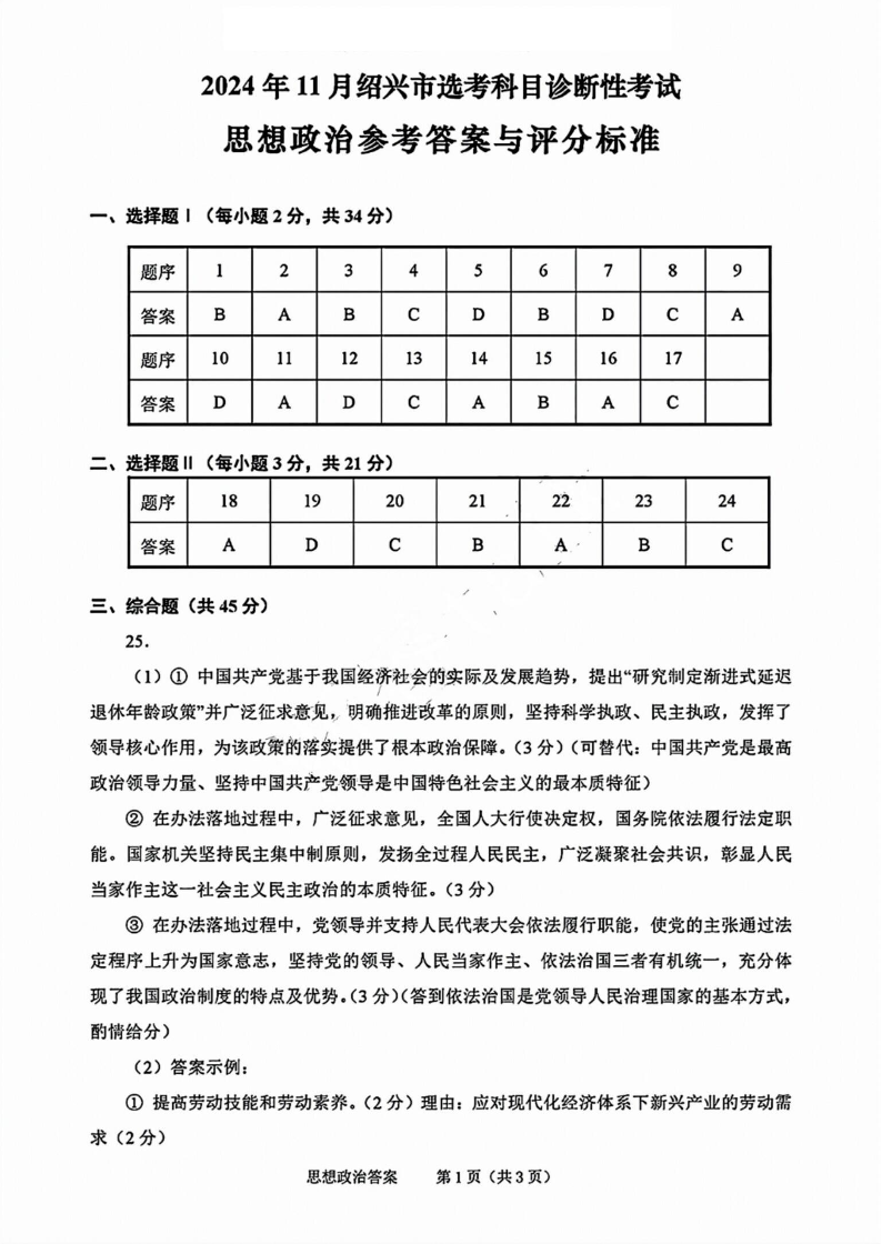 2024年11月绍兴市高考科目诊断性考试+政治答案