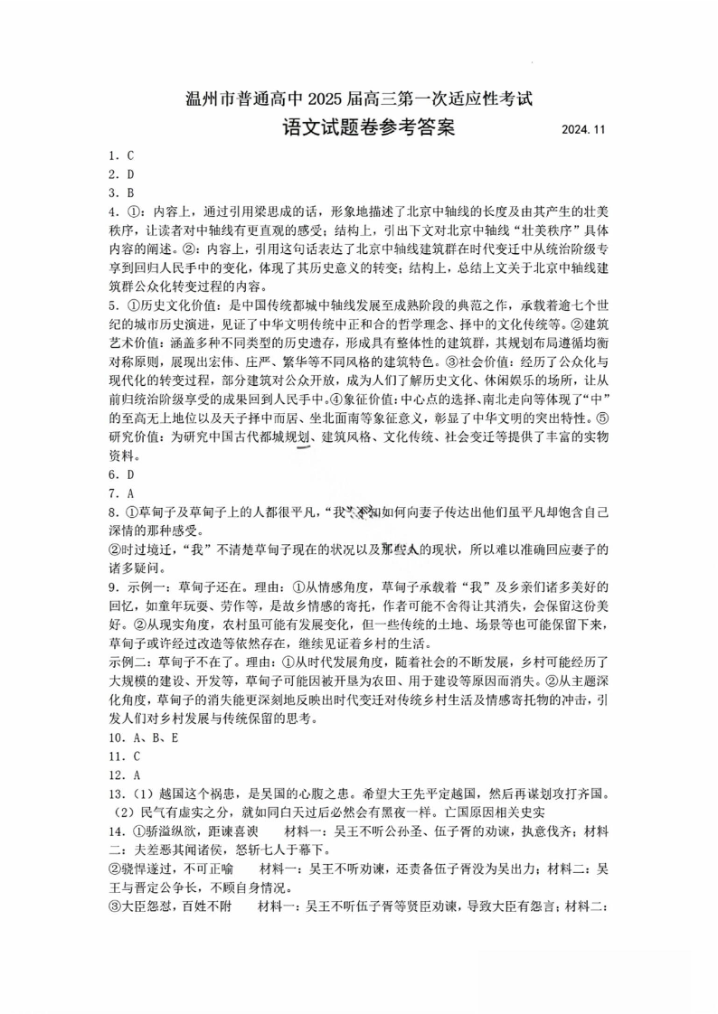 浙江省温州市普通高中2025届高三第一次适应性考试+语文答案