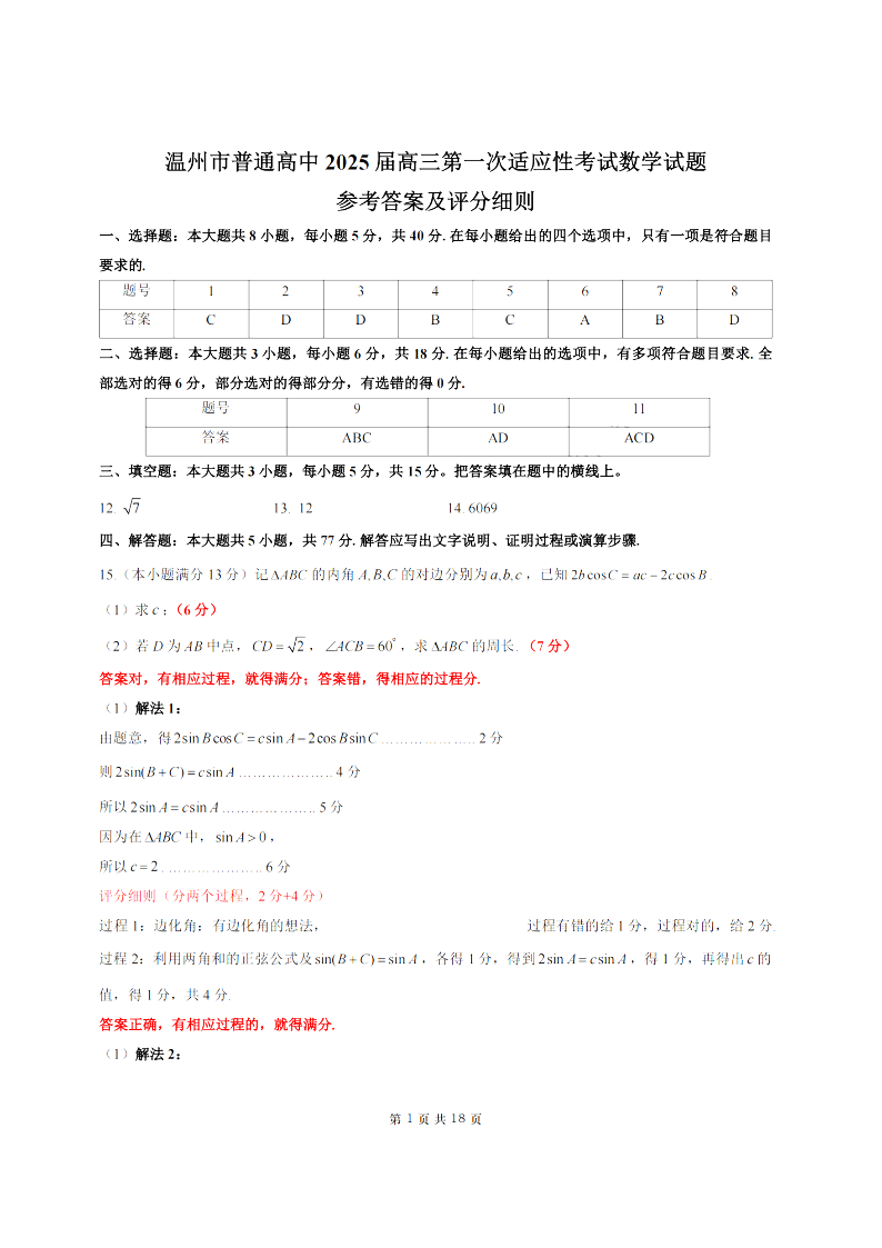 浙江省温州市普通高中2025届高三第一次适应性考试+数学答案